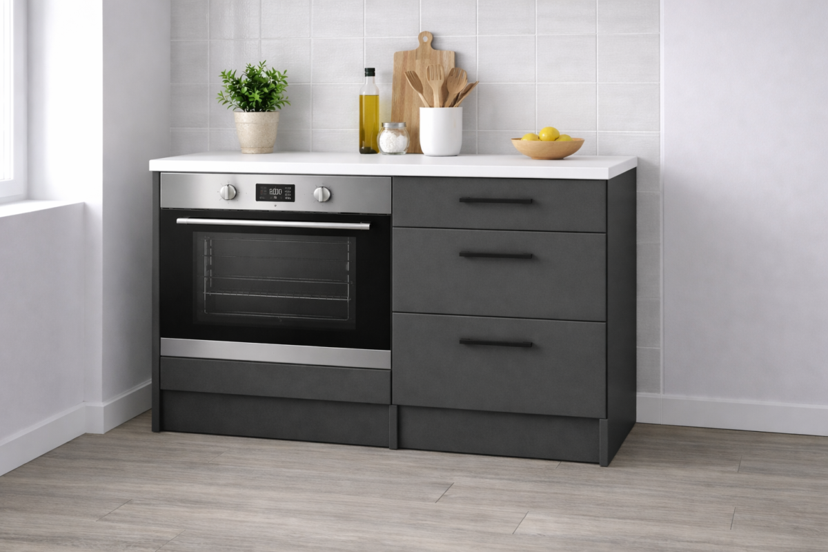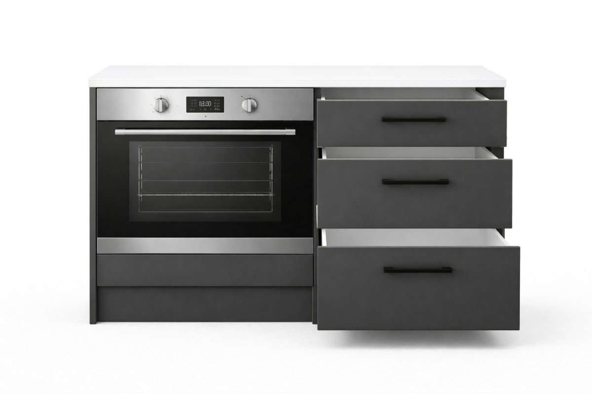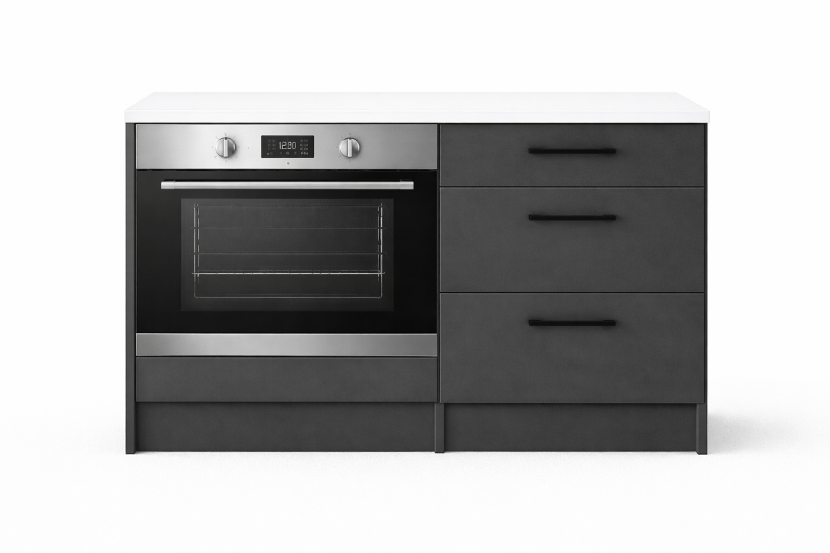 Aka Ankastre Fırın Modülü-Çok Amaçlı Dolap -110 cm -3 Çekmeceli-Laminat Beyaz Tezgah Dahil – Antrasit
