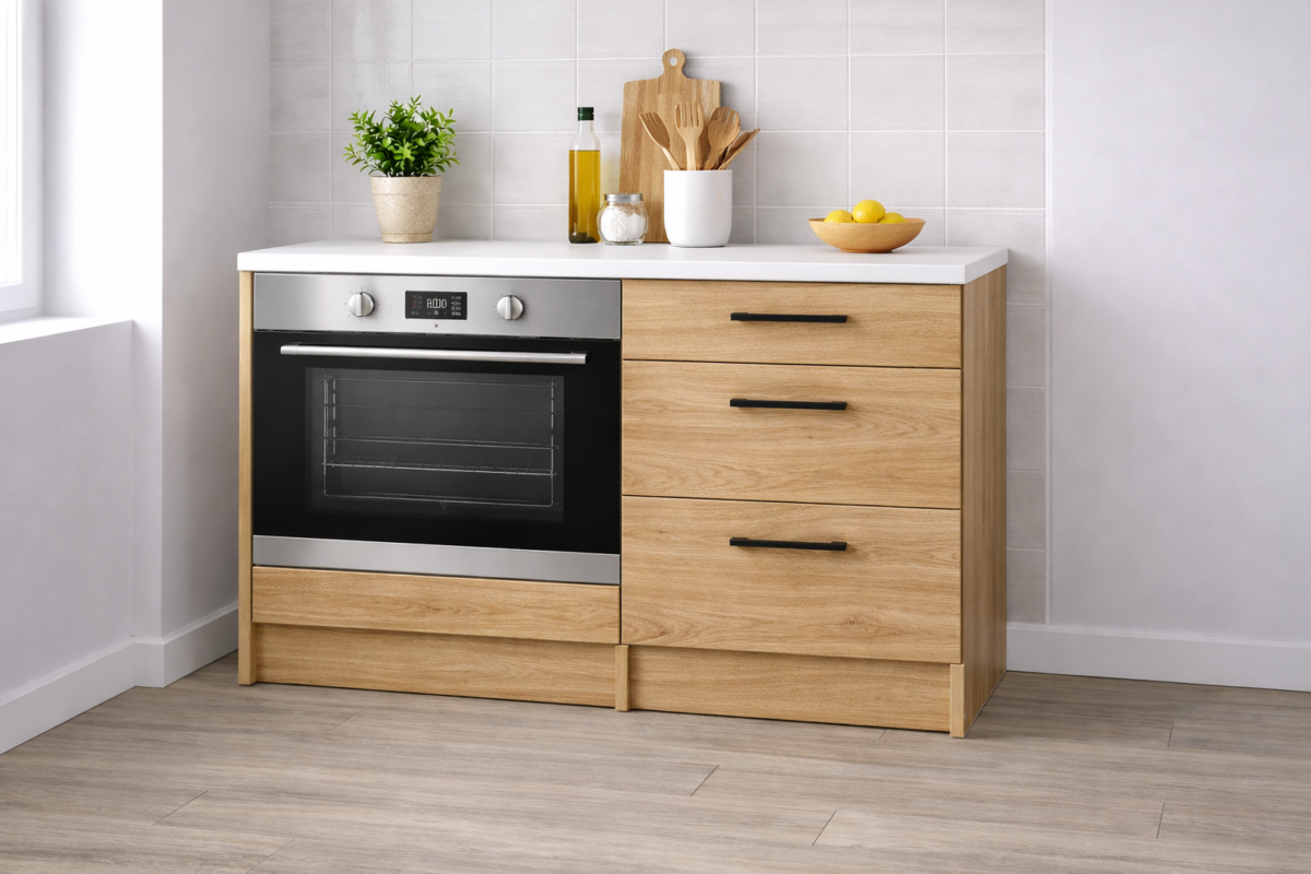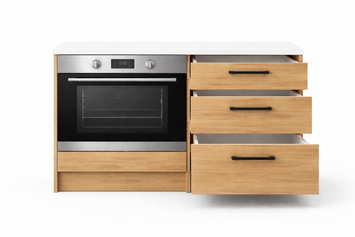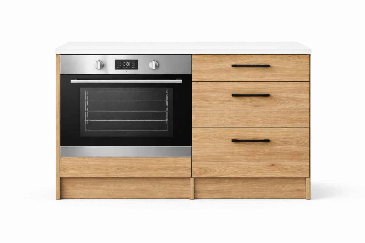 Aka Ankastre Fırın Modülü-Çok Amaçlı Dolap -110 cm -3 Çekmeceli-Laminat Beyaz Tezgah Dahil – Atlantik Çam