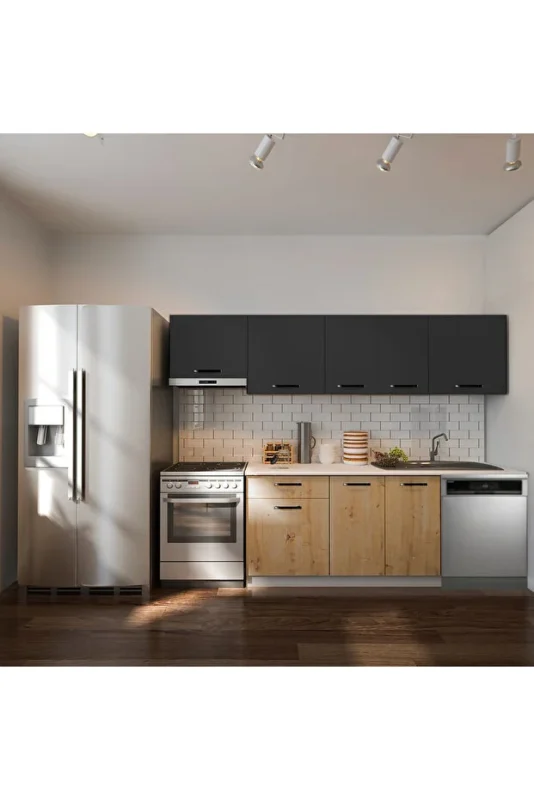 Debre Hazır Mutfak Dolabı 260 cm-Beyaz Laminat Tezgah Dahil-Bulaşık Makinesi Yeri Mevcut-Mat – Meşe-Antrasit
