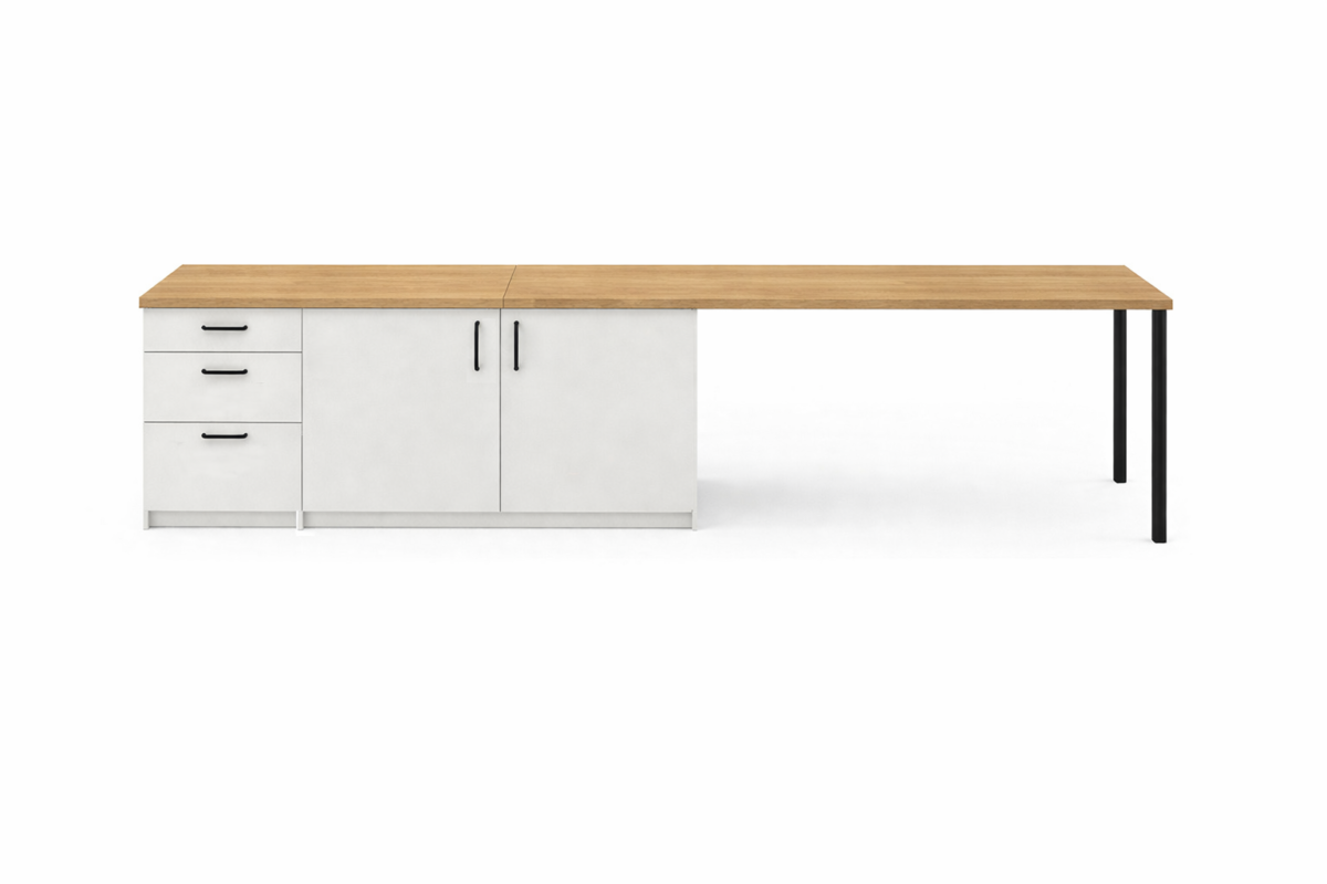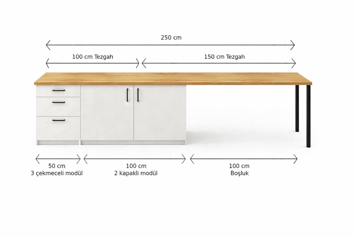 50 cm 3 çekmeceli 1 modül 100 cm 2 kapaklı 1 modülden oluşmakta olup 100 cmlık modulun içerisinde 1 adet raf bulunmaktadır.