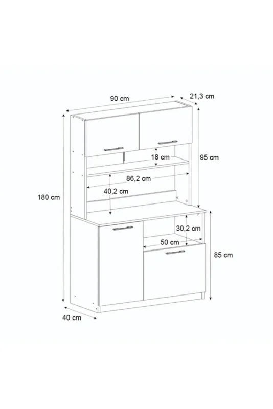 Mutfak dolabı :Genişlik: 90 cm derinlik:40 cm yükseklik:180 -Paket İçeriği: 1 Adet Mutfak Modül, Kurulum Şablonu ve Bağlantı Aksesuarları -Geniş saklama alanı ve raflar sayesinde eşyalarınızı muhafaza edebilir,dekoratif aksesuarlarla tamamlayabilirsiniz.