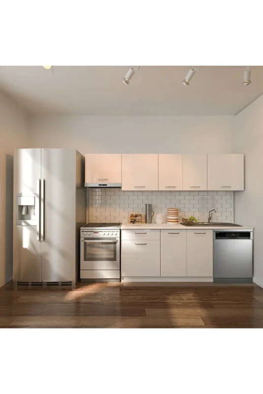 Loşna Hazır Mutfak Dolabı 260 cm-Beyaz Laminat Tezgah Dahil-Bulaşık Makinesi Yeri Mevcut-Parlak – Beyaz