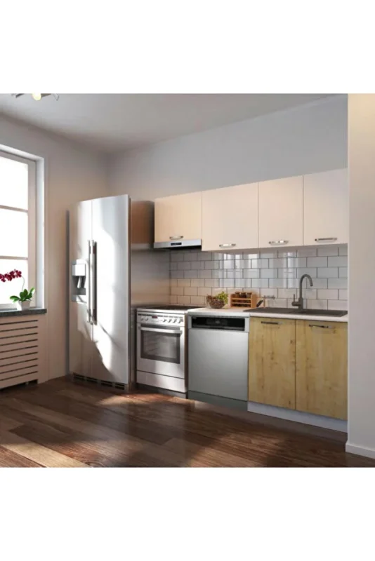 Ulza Hazır Mutfak Dolabı 200 Cm –Beyaz Laminat Tezgah Dahil-Bulaşık Makinesi Yeri Mevcut-Mat – Meşe-Beyaz